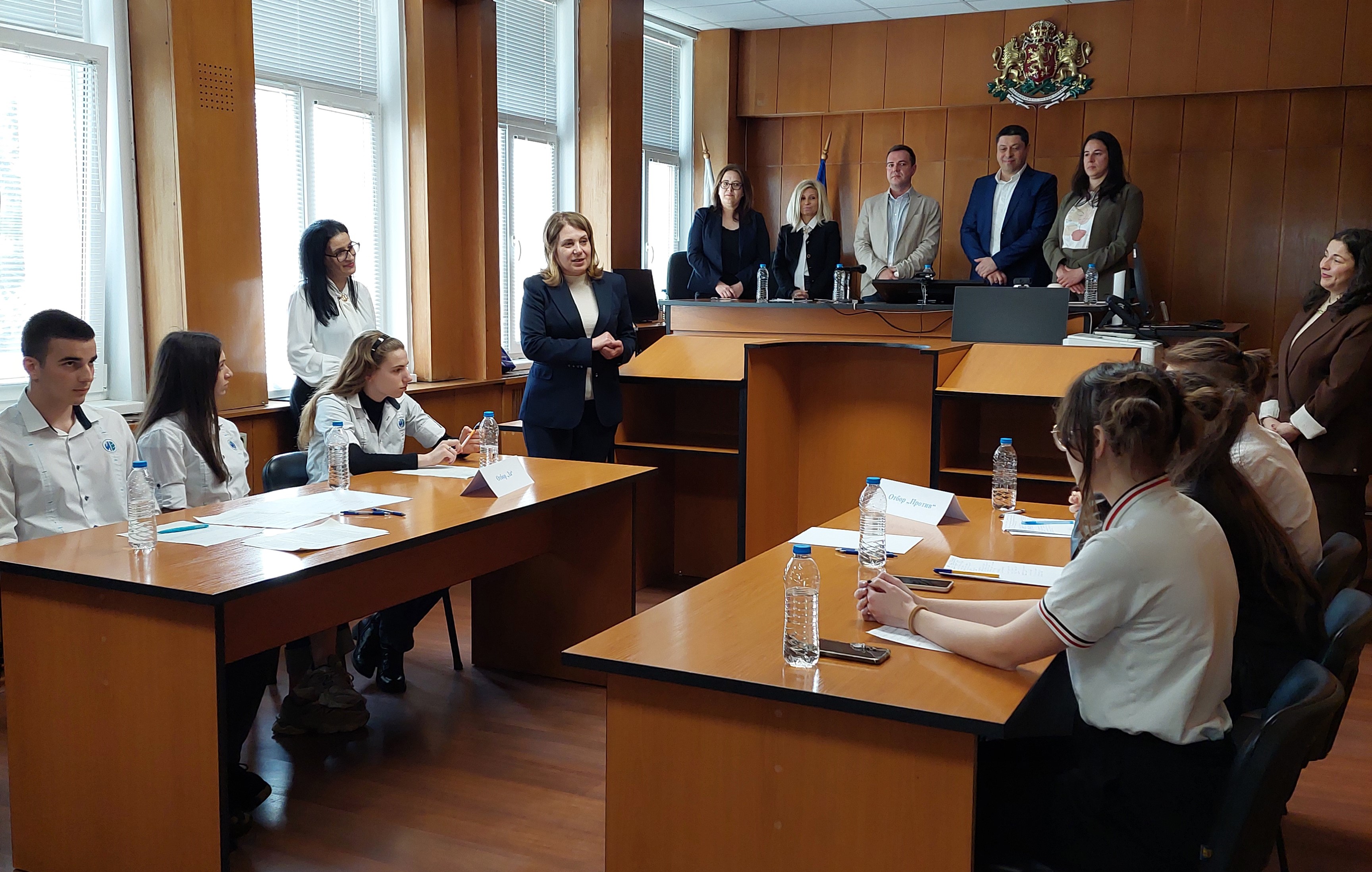 В съдебната зала на Окръжен съд – Варна сили премериха победителите от полуфиналите – отборите на IV ЕГ „Фредерик Жолио-Кюри“ и V ЕГ „Йоан Екзарх“. Младите таланти бяха посрещнати от председателя на Окръжния съд съдия Цвета Павлова и председателя на Районния съд съдия Магдалена Давидова.